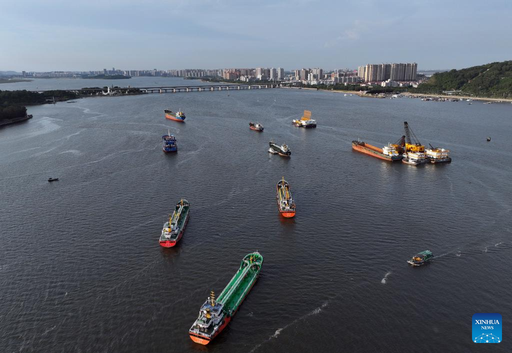 An aerial drone photo taken on July 6, 2025 shows vessels sailing in the waters of Fangchenggang Port area in Fangchenggang City, south China's Guangxi Zhuang Autonomous Region. Fangchenggang, named after its port, is located at the China-Vietnam border and serves as a crucial hub of the New International Land-Sea Trade Corridor. The city is also situated on the shoreline of the Beibu Gulf and features seaside tourist attractions such as piers and beaches. (Xinhua/Huang Xiaobang)