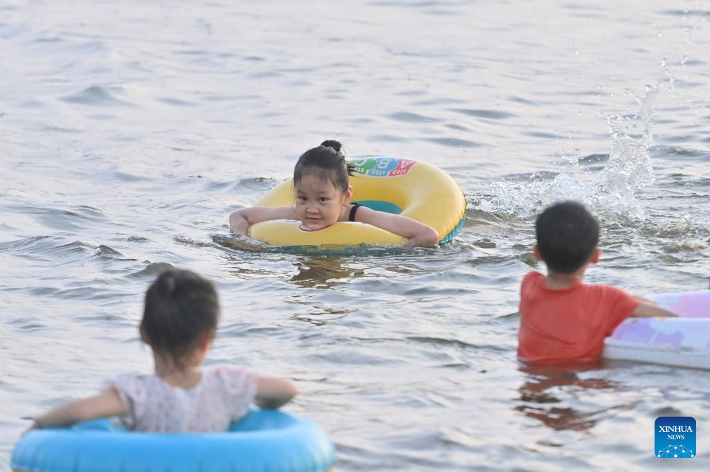 Kids enjoy their leisure time at a scenic area in Fangchenggang City, south China's Guangxi Zhuang Autonomous Region, July 6, 2025. Fangchenggang, named after its port, is located at the China-Vietnam border and serves as a crucial hub of the New International Land-Sea Trade Corridor. The city is also situated on the shoreline of the Beibu Gulf and features seaside tourist attractions such as piers and beaches. (Xinhua/Huang Xiaobang)