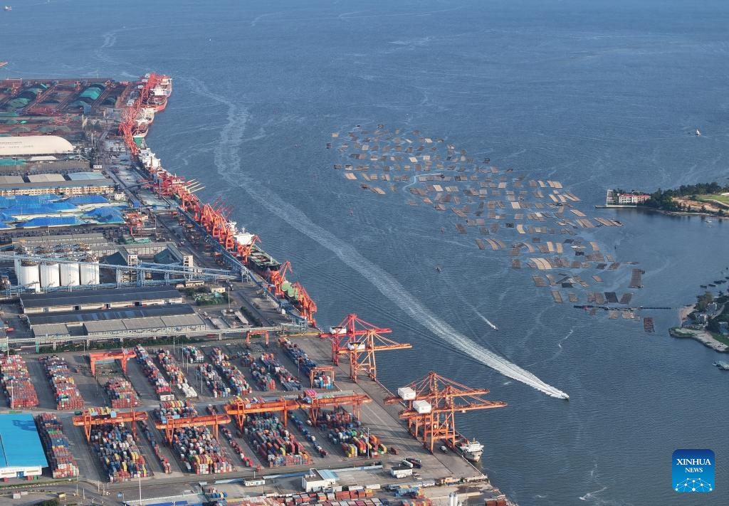 An aerial drone photo taken on July 6, 2025 shows a view of Fangchenggang Port in Fangchenggang City, south China's Guangxi Zhuang Autonomous Region. Fangchenggang, named after its port, is located at the China-Vietnam border and serves as a crucial hub of the New International Land-Sea Trade Corridor. The city is also situated on the shoreline of the Beibu Gulf and features seaside tourist attractions such as piers and beaches. (Xinhua/Huang Xiaobang)