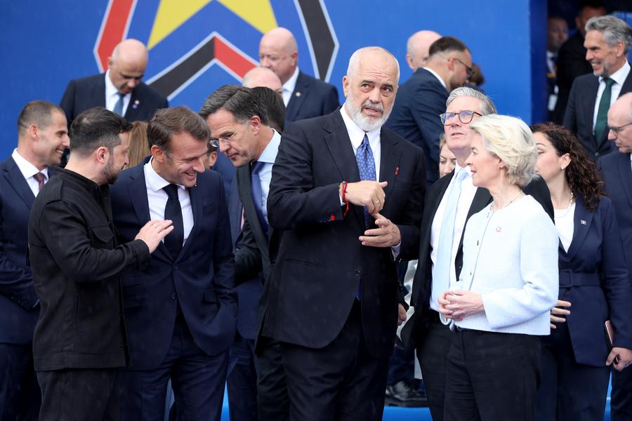 Attendees chat during the 6th European Political Community (EPC) Summit in Tirana, Albania, May 16, 2025. (Xinhua/Zhao Dingzhe)