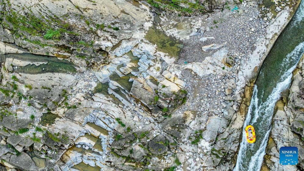 An aerial drone photo taken on July 21, 2025 shows people rafting in an inflatable boat on Luobei River in Guiding County, southwest China's Guizhou Province. (Xinhua/Ou Dongqu)