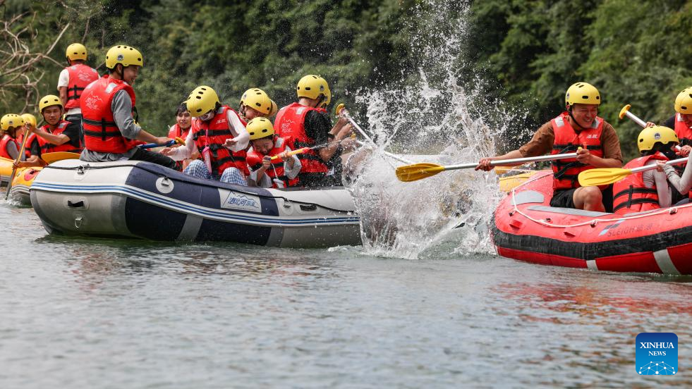 This photo taken on July 21, 2025 shows people rafting in inflatable boats on Luobei River in Guiding County, southwest China's Guizhou Province. (Xinhua/Ou Dongqu)