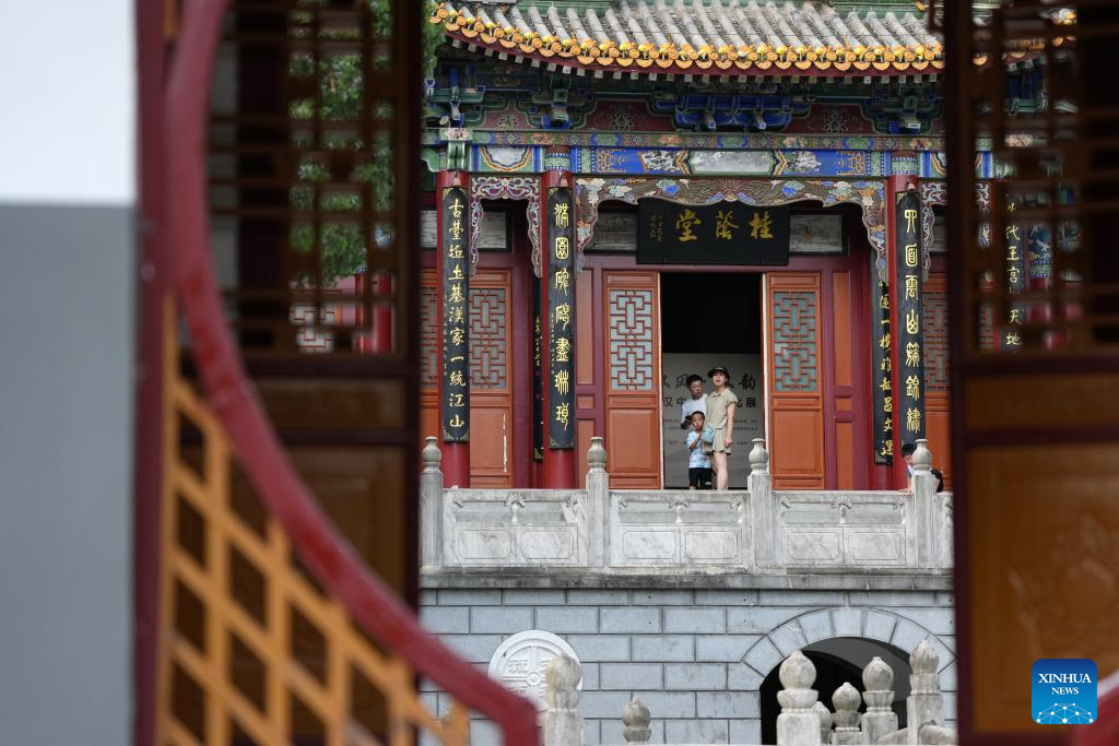 Tourists visit the relics of the ancient pavilion in Hanzhong, northwest China's Shaanxi Province, July 22, 2025. Hanzhong is nestled between the Qinling and Daba Mountains, with the Hanjiang River, a tributary of the Yangtze River, flowing through the city. For more than 2,300 years, it has served as a vital nexus for the river network and transportation routes connecting the north and south. The city is rich in resources and, unlike other areas in Shaanxi, it shows distinct characteristics in dialect and culinary traditions influenced by southwest China's Sichuan. (Xinhua/Li Yibo)