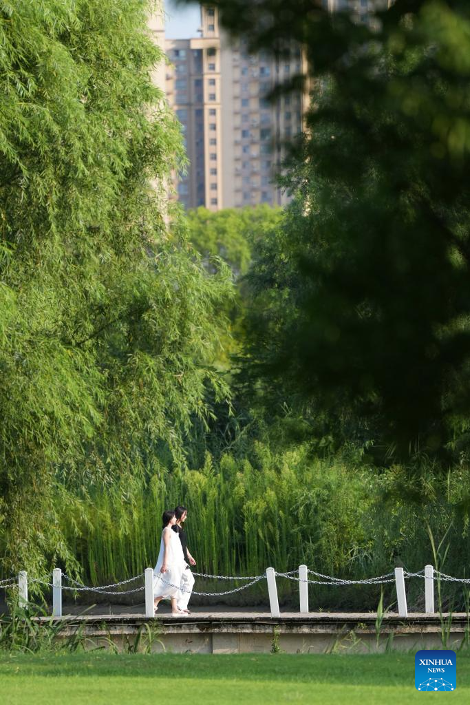 Citizens enjoy themselves at a wetland park in Hanzhong, northwest China's Shaanxi Province, July 21, 2025. Hanzhong is nestled between the Qinling and Daba Mountains, with the Hanjiang River, a tributary of the Yangtze River, flowing through the city. For more than 2,300 years, it has served as a vital nexus for the river network and transportation routes connecting the north and south. The city is rich in resources and, unlike other areas in Shaanxi, it shows distinct characteristics in dialect and culinary traditions influenced by southwest China's Sichuan. (Xinhua/Li Yibo)