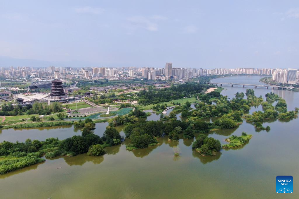 An aerial drone photo shows the view of a wetland park in Hanzhong, northwest China's Shaanxi Province, July 21, 2025. Hanzhong is nestled between the Qinling and Daba Mountains, with the Hanjiang River, a tributary of the Yangtze River, flowing through the city. For more than 2,300 years, it has served as a vital nexus for the river network and transportation routes connecting the north and south. The city is rich in resources and, unlike other areas in Shaanxi, it shows distinct characteristics in dialect and culinary traditions influenced by southwest China's Sichuan. (Xinhua/Li Yibo)