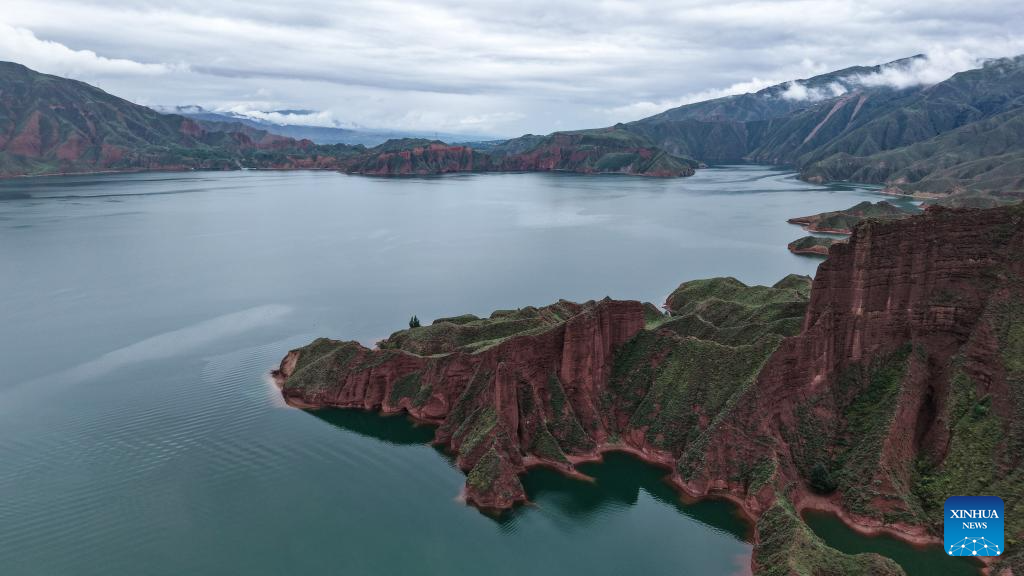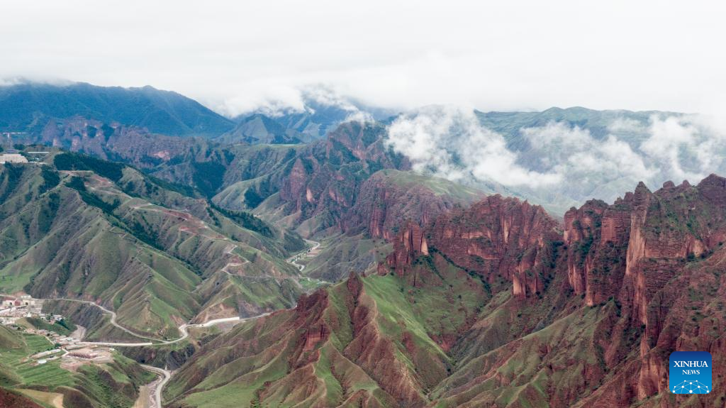 An aerial drone photo taken on July 24, 2025 shows a view of the Kanbula National Geopark in Huangnan Tibetan Autonomous Prefecture, northwest China's Qinghai Province. Nestled on the northeastern edge of the Qinghai-Tibet Plateau, the Kanbula National Geopark spans roughly 3,149 square kilometers with striking fiery-red Danxia landforms, towering jagged peaks, hidden caves and emerald lakes. Beyond its visual splendor, the park's true value lies beneath the surface, serving as a premier location for geoscientific research and public science education. (Xinhua/Wang Yan)
