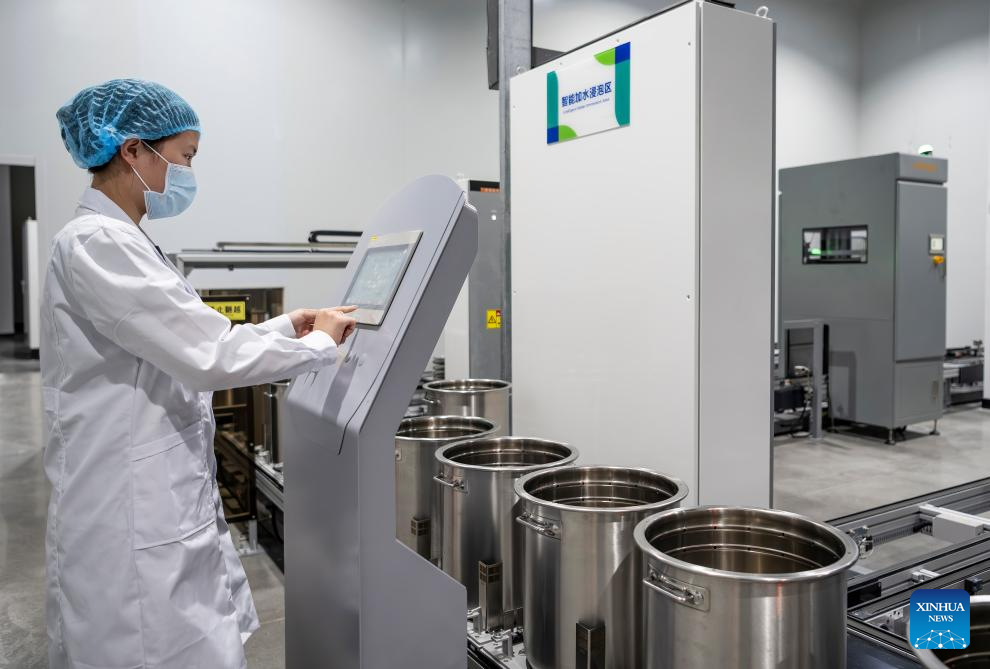 A staff member operates at the digitized factory for traditional Chinese medicine decoction under a pharmaceutical company in Quanzhou, southeast China's Fujian Province, July 24, 2025. Riding on digital transformation as a driving force, Quanzhou City managed to enhance the quality and efficiency of its industrial economy in recent years. This has laid a sustainable ground for the upgrading of the traditional sectors, and accelerated the shift from simple manufacturing to smart creation. (Xinhua/Wei Peiquan)