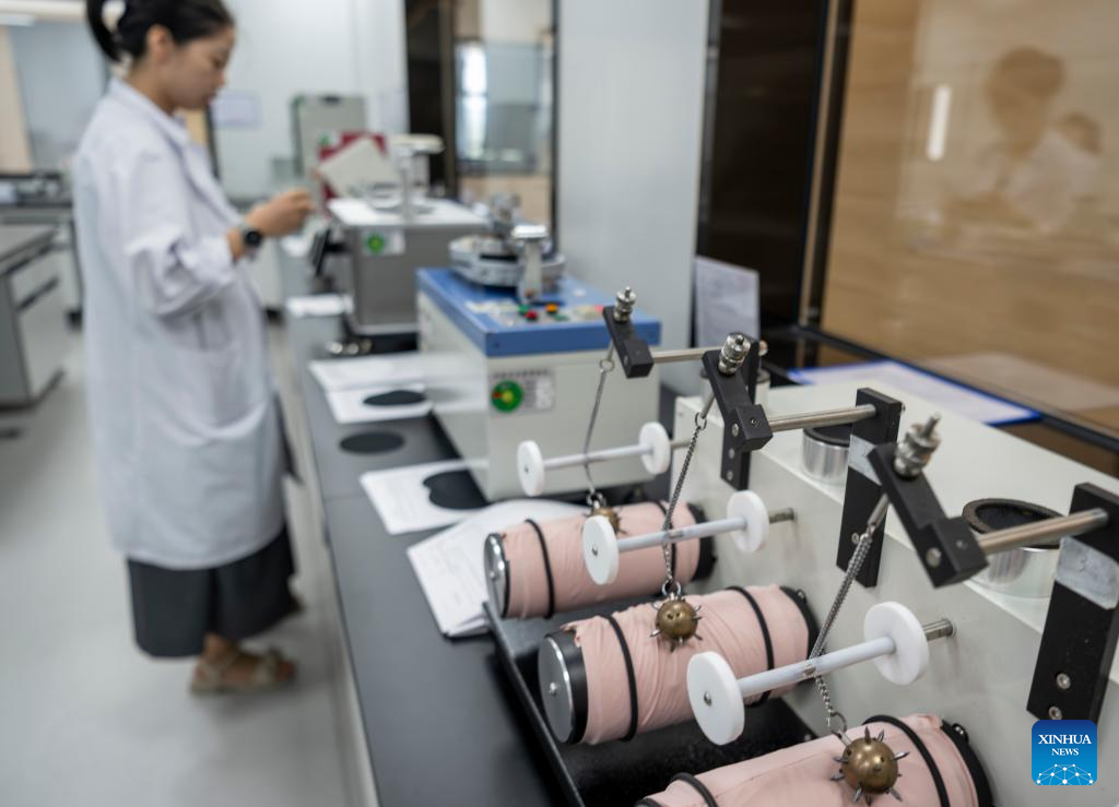 A staff member examines fabrics at a laboratory of Lianxingfa Knitting Co., Ltd. in Quanzhou, southeast China's Fujian Province, July 24, 2025. Riding on digital transformation as a driving force, Quanzhou City managed to enhance the quality and efficiency of its industrial economy in recent years. This has laid a sustainable ground for the upgrading of the traditional sectors, and accelerated the shift from simple manufacturing to smart creation. (Xinhua/Wei Peiquan)