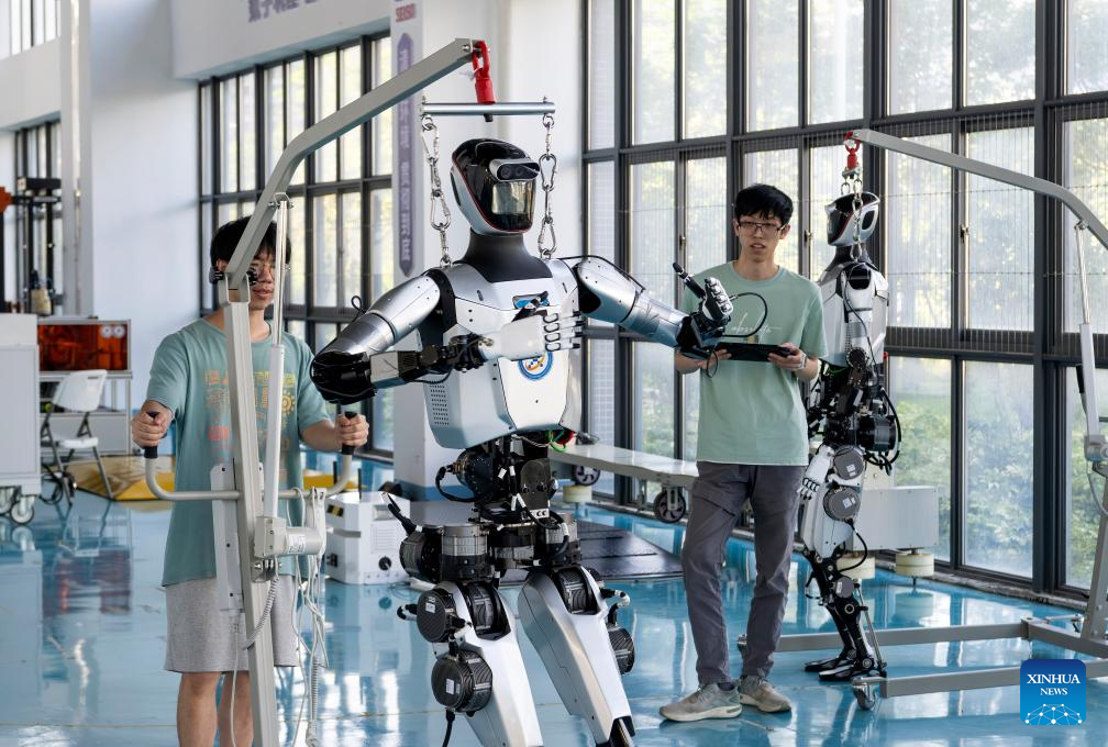 Staff members debug humanoid robots at Fujian (Quanzhou) Institute of Advanced Manufacturing Technology in Quanzhou, southeast China's Fujian Province, July 24, 2025. Riding on digital transformation as a driving force, Quanzhou City managed to enhance the quality and efficiency of its industrial economy in recent years. This has laid a sustainable ground for the upgrading of the traditional sectors, and accelerated the shift from simple manufacturing to smart creation. (Xinhua/Wei Peiquan)