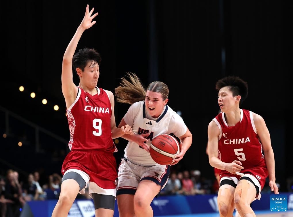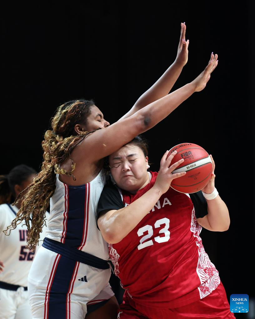 Cao Boyi (L) of China breaks through during the women's basketball final between China and the United States at the Rhine-Ruhr 2025 FISU World University Games in Essen, Germany, July 25, 2025. (Xinhua/Zhang Fan)