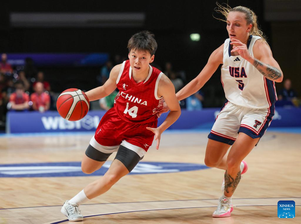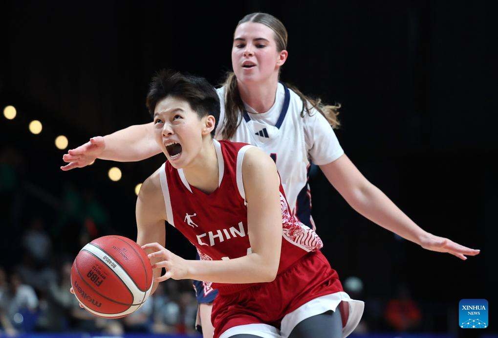 Cao Boyi (Front) of China breaks through during the women's basketball final between China and the United States at the Rhine-Ruhr 2025 FISU World University Games in Essen, Germany, July 25, 2025. (Xinhua/Zhang Chen)