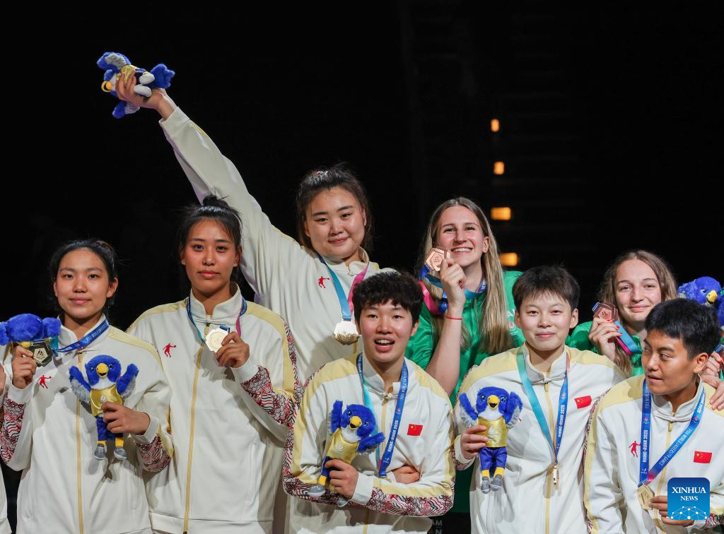 Players of China and Hungary celebrate during the awarding ceremony of the women's basketball at the Rhine-Ruhr 2025 FISU World University Games in Essen, Germany, July 25, 2025. (Xinhua/Zhang Fan)