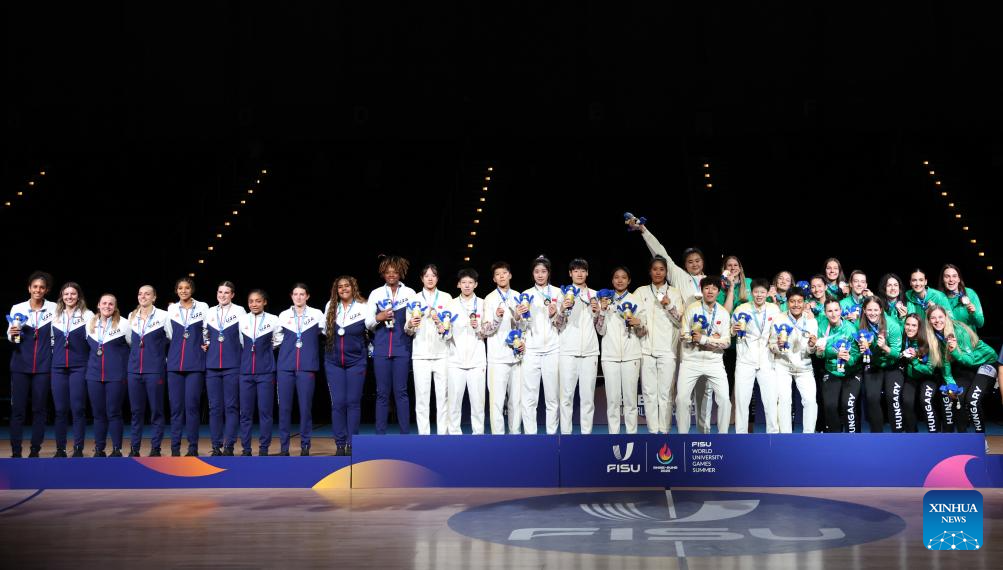 Gold medal winner team China (C), silver medal winner team the United States (L) and bronze medal team Hungary pose for photos during the awarding ceremony of the women's basketball final at the Rhine-Ruhr 2025 FISU World University Games in Essen, Germany, July 25, 2025. (Xinhua/Zhang Chen)