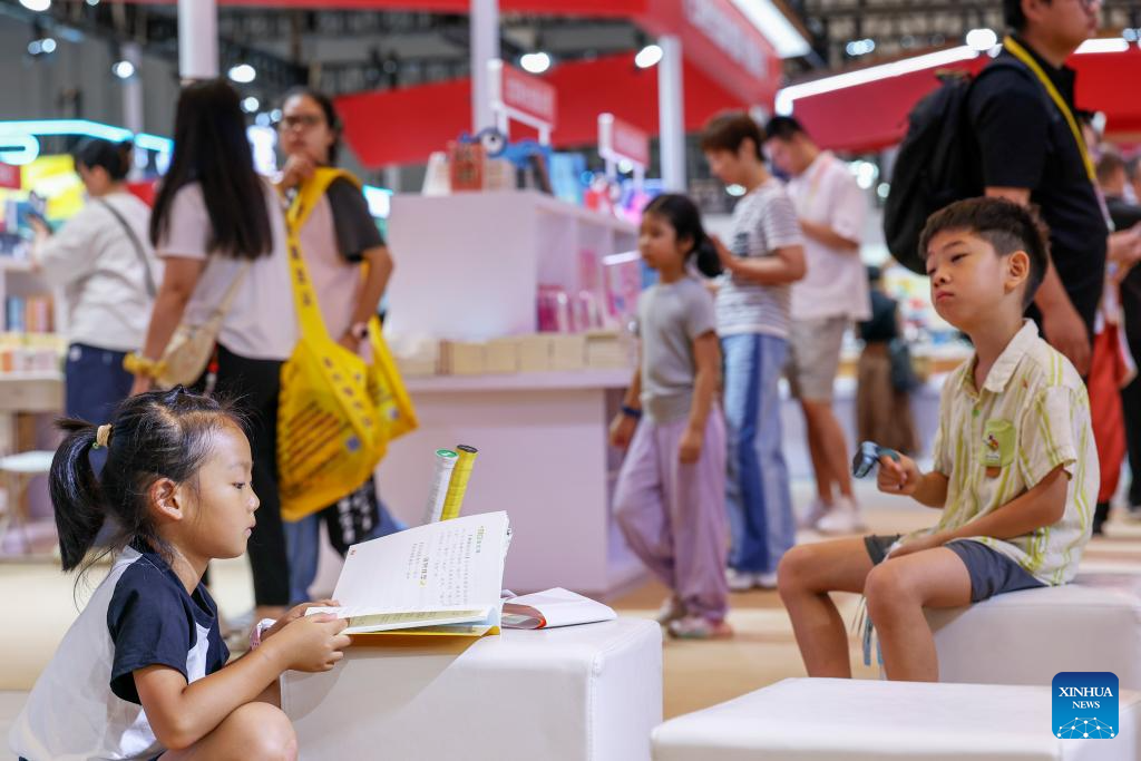 A girl reads a book during the 33rd National Book Expo in southwest China's Chongqing, July 25, 2025. Over 1,000,000 publications of various types are on display, either online or on site, at the expo, which kicked off here on Friday with free admission, and will last till July 28. (Xinhua/Chen Cheng)