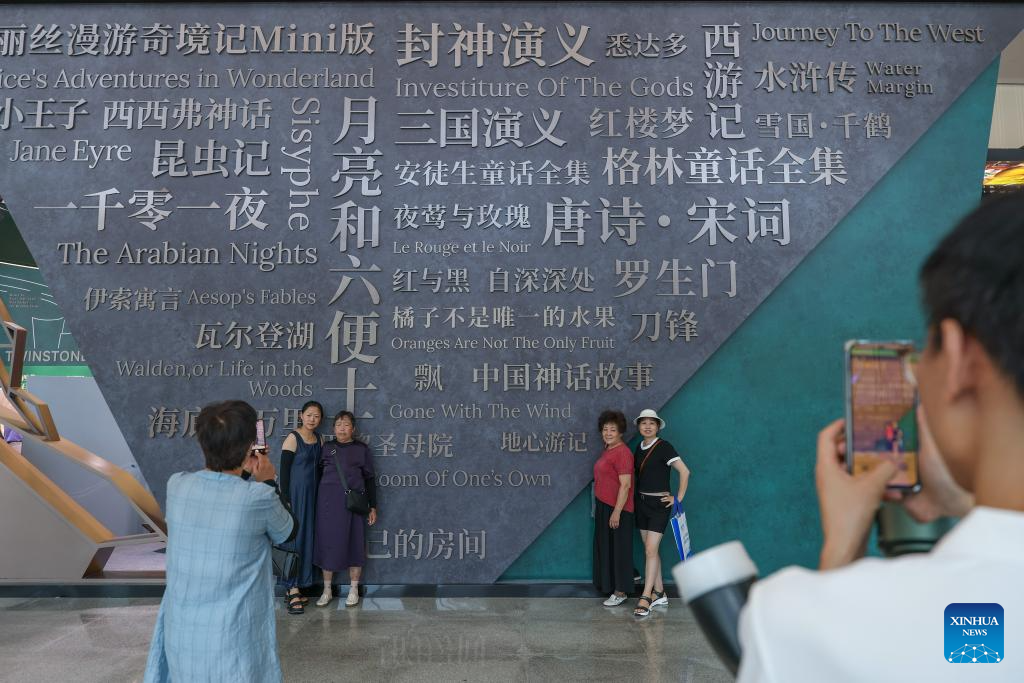 Visitors pose for photos with an installation at the 33rd National Book Expo in southwest China's Chongqing, July 25, 2025. Over 1,000,000 publications of various types are on display, either online or on site, at the expo, which kicked off here on Friday with free admission, and will last till July 28. (Xinhua/Chen Cheng)