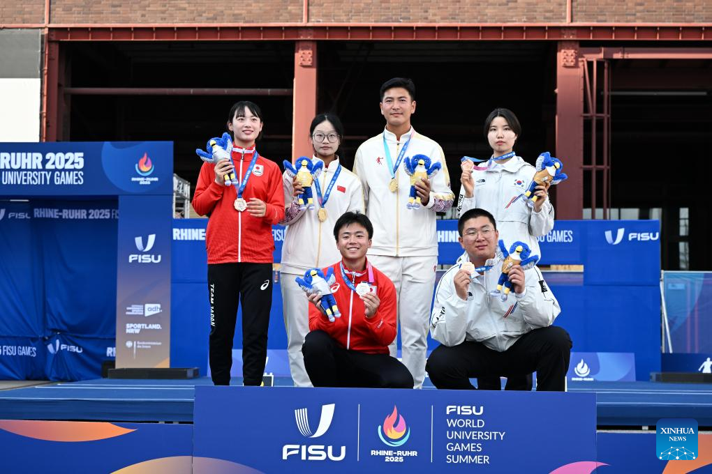 Gold medalists Liu Yanxiu (2nd L, up) and Wang Yan (2nd R, up) of China, silver medalists Sonoda Waka (1st L, up)/ Funahashi Yuya (L, down) of Japan, and Nam Suhyeon (1st R, up)/Seo Mingi (R, down) of South Korea attend the awarding ceremony of the mixed recurve team gold medal match of archery between China and Japan at the Rhine-Ruhr 2025 FISU World University Games in Essen, Germany, July 25, 2025. (Xinhua/Lian Yi)