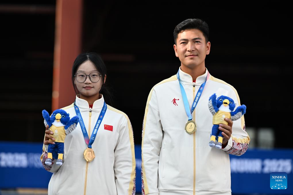 Gold medalists Liu Yanxiu (L) and Wang Yan of China attend the awarding ceremony of the mixed recurve team gold medal match of archery between China and Japan at the Rhine-Ruhr 2025 FISU World University Games in Essen, Germany, July 25, 2025. (Xinhua/Lian Yi)