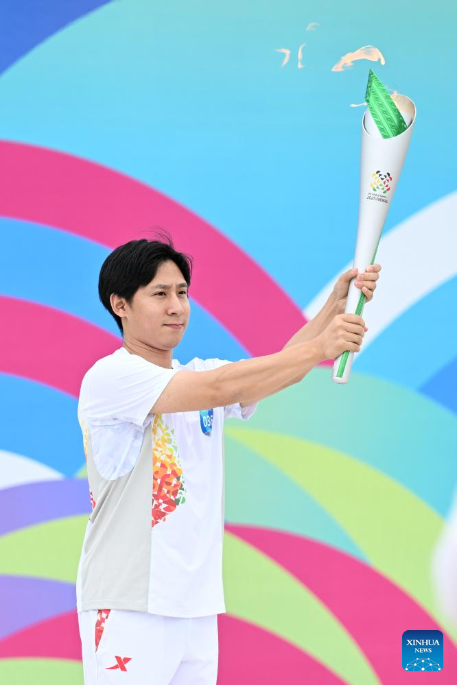 Torch bearer Han Cong holds the torch during the World Games 2025 Torch Relay in Chengdu, southwest China's Sichuan Province, on July 26, 2025. (Xinhua/Feng Kaihua)