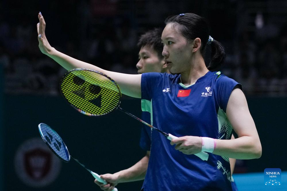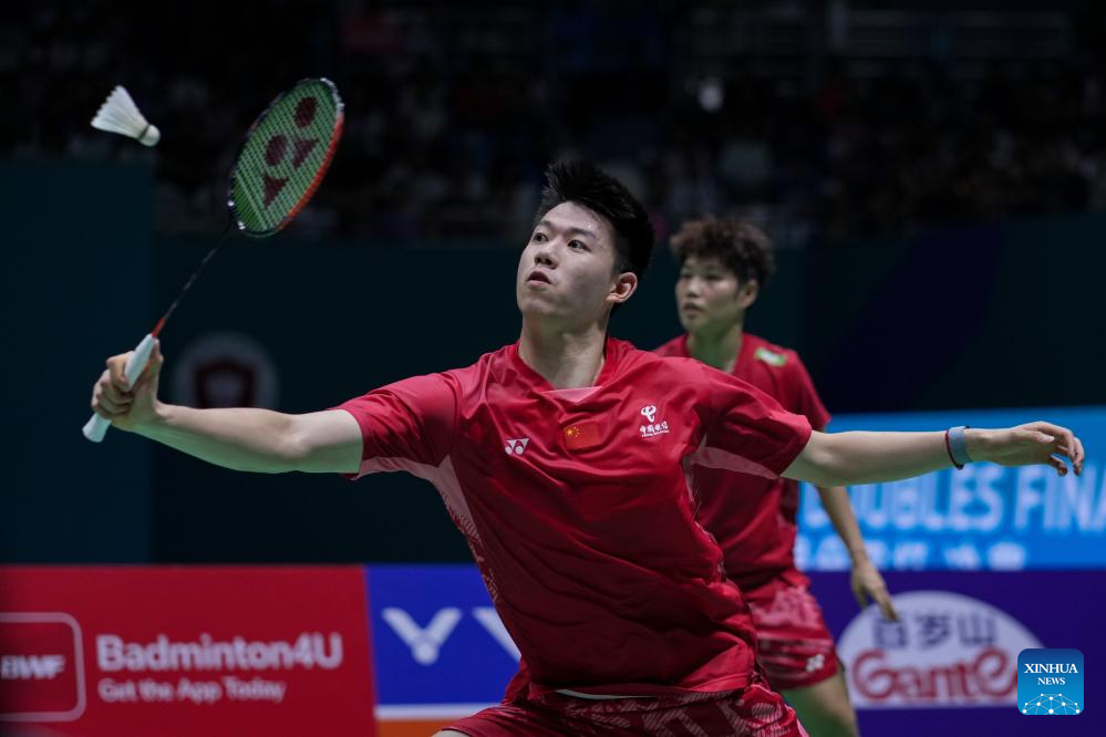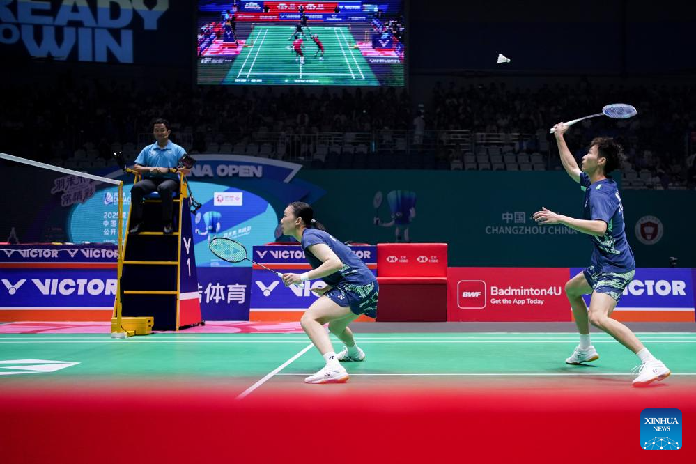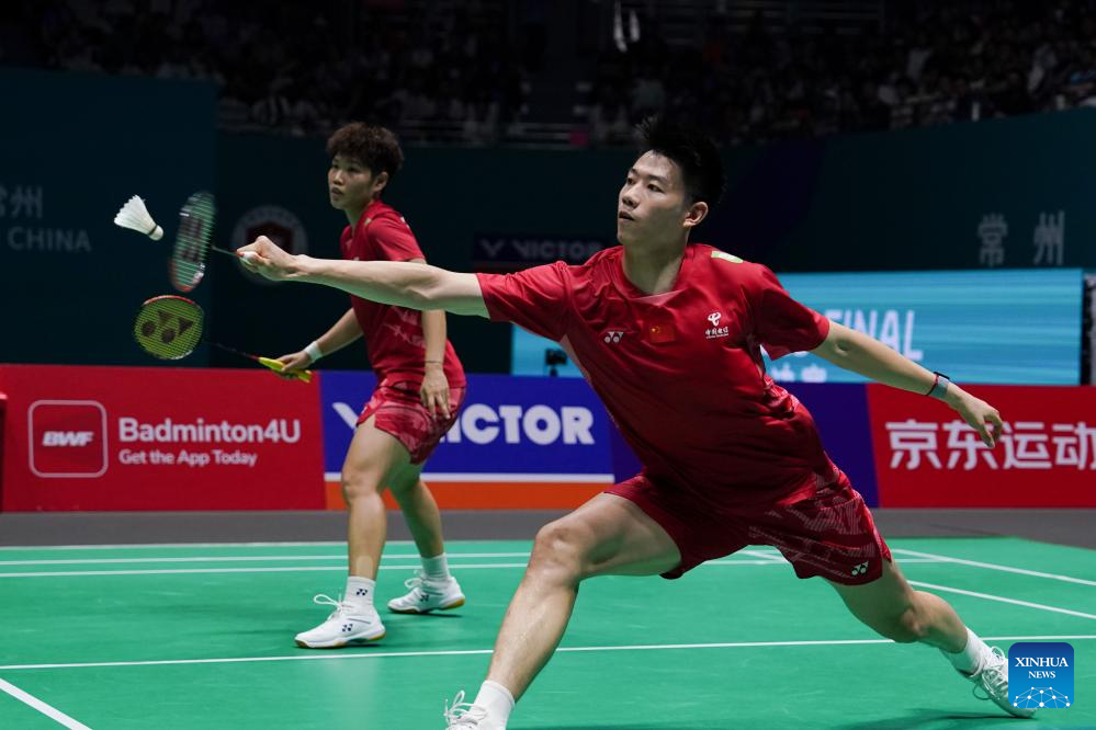Jiang Zhenbang/Wei Yaxin (front) of China compete during the mixed doubles final between Feng Yanzhe/Huang Dongping of China and Jiang Zhenbang/Wei Yaxin of China at the China Open 2025 badminton tournament in Changzhou, east China's Jiangsu Province, July 27, 2025. (Xinhua/Li Bo)