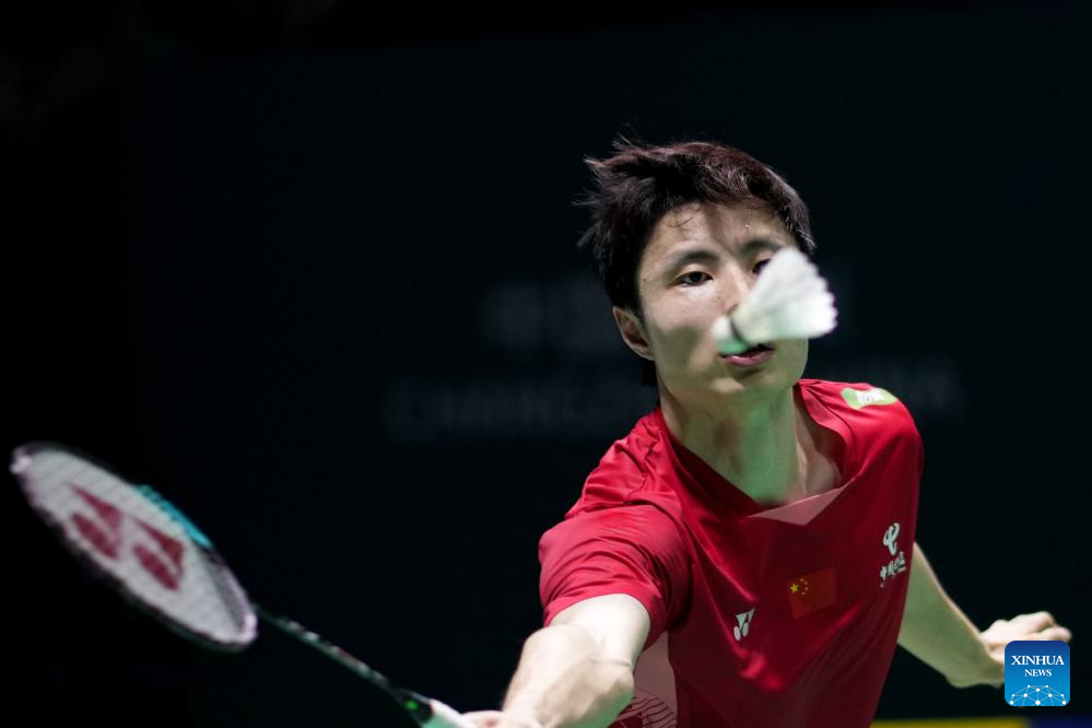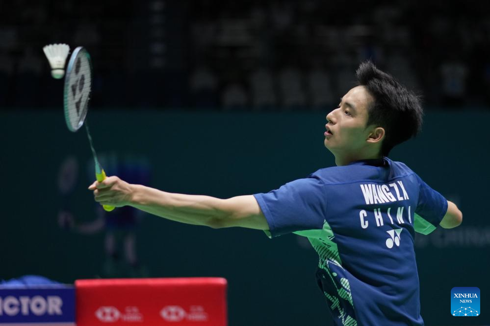 Wang Zhengxing of China competes during the men's singles final match between Shi Yuqi of China and Wang Zhengxing of China at the China Open 2025 badminton tournament in Changzhou, east China's Jiangsu Province, July 27, 2025. (Xinhua/Li Bo)
