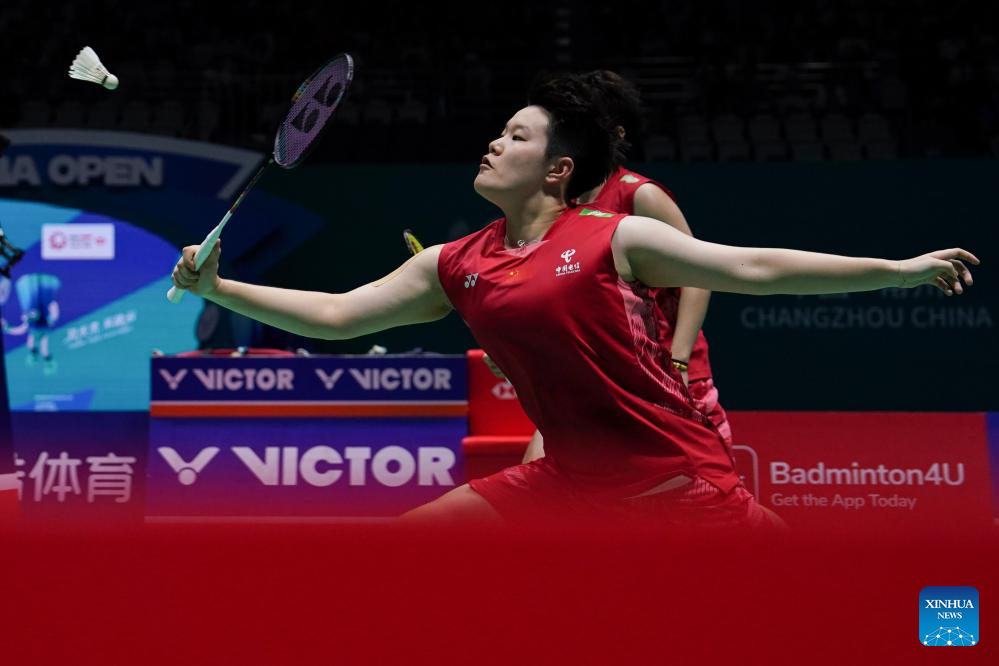 Jia Yifan (front) /Zhang Shuxian of China compete during the women's doubles final match between Liu Shengshu/Tan Ning of China and Jia Yifan/Zhang Shuxian of China at the China Open 2025 badminton tournament in Changzhou, east China's Jiangsu Province, July 27, 2025. (Xinhua/Li Bo)