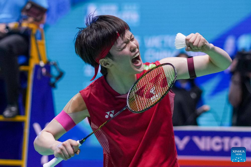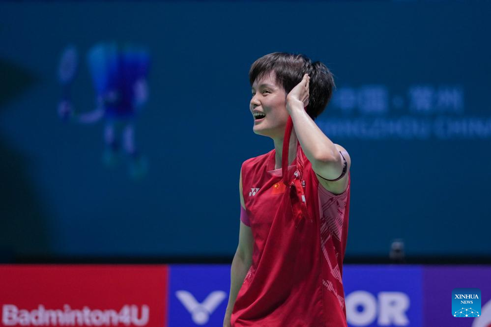 Wang Zhiyi of China celebrates after the women's singles final match between Wang Zhiyi of China and Han Yue of China at the China Open 2025 badminton tournament in Changzhou, east China's Jiangsu Province, July 27, 2025. (Xinhua/Li Bo)