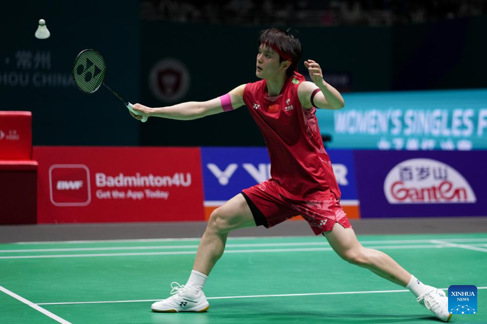 Han Yue of China competes during the women's singles final match between Wang Zhiyi of China and Han Yue of China at the China Open 2025 badminton tournament in Changzhou, east China's Jiangsu Province, July 27, 2025. (Xinhua/Li Bo)