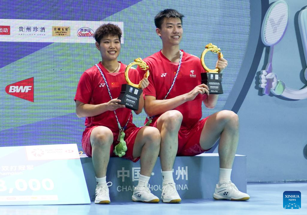 Feng Yanzhe (L) /Huang Dongping of China pose for photos after the mixed doubles final between Feng Yanzhe/Huang Dongping of China and Jiang Zhenbang/Wei Yaxin of China at the China Open 2025 badminton tournament in Changzhou, east China's Jiangsu Province, July 27, 2025. (Xinhua/Li Bo)