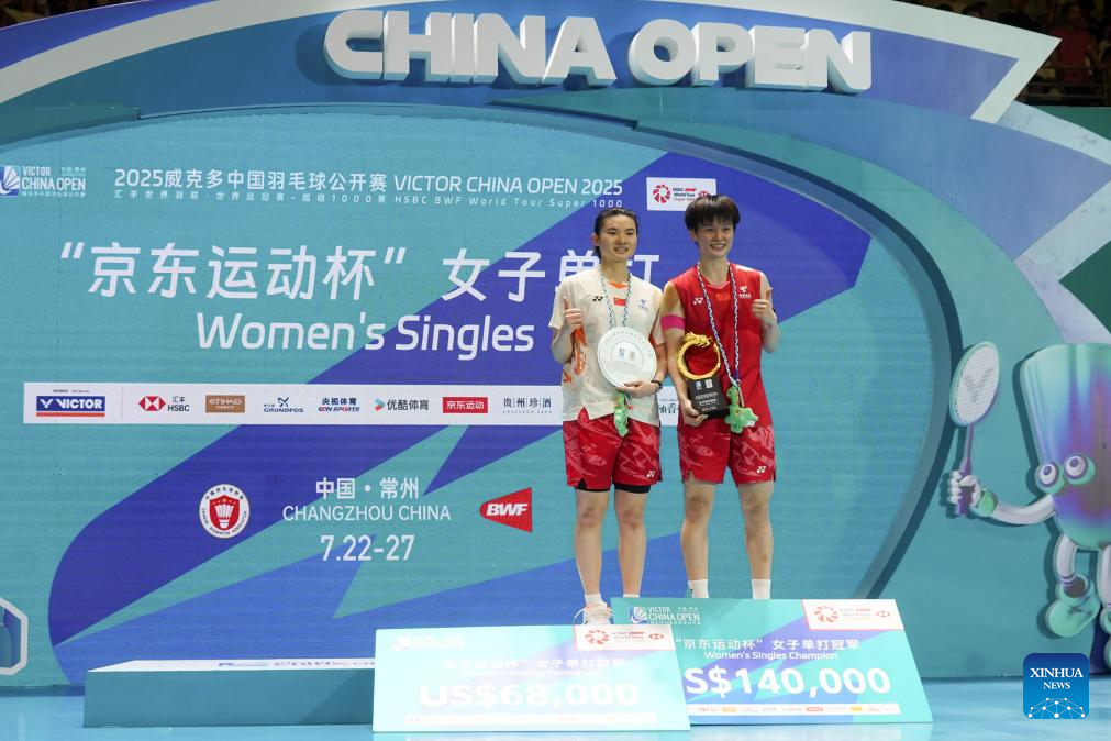 Winner Wang Zhiyi (R) of China and runner-up Han Yue of China pose for photos during the awarding ceremony for the women's singles match between Wang Zhiyi of China and Han Yue of China at the China Open 2025 badminton tournament in Changzhou, east China's Jiangsu Province, July 27, 2025. (Photo by Liu Zhenrui/Xinhua)