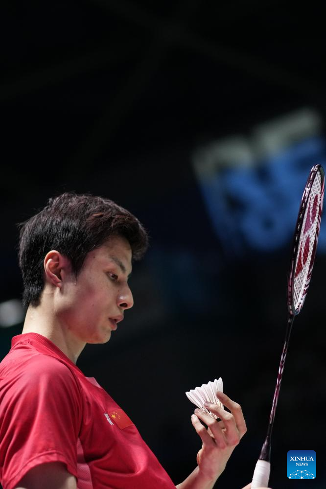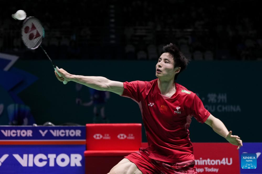 Shi Yuqi of China competes during the men's singles final match between Shi Yuqi of China and Wang Zhengxing of China at the China Open 2025 badminton tournament in Changzhou, east China's Jiangsu Province, July 27, 2025. (Xinhua/Li Bo)