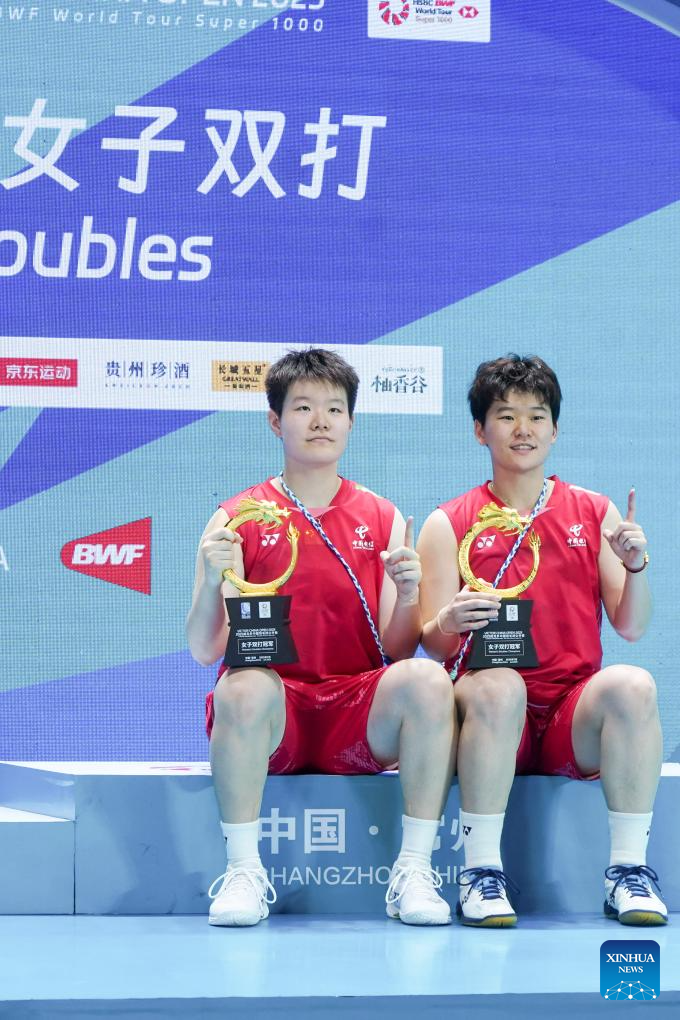 Liu Shengshu/Tan Ning (R) of China pose with their trophies during the awarding ceremony for the women's doubles at the China Open 2025 badminton tournament in Changzhou, east China's Jiangsu Province, July 27, 2025. (Photo by Liu Zhenrui/Xinhua)