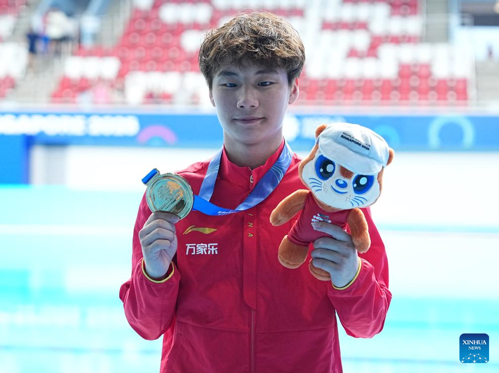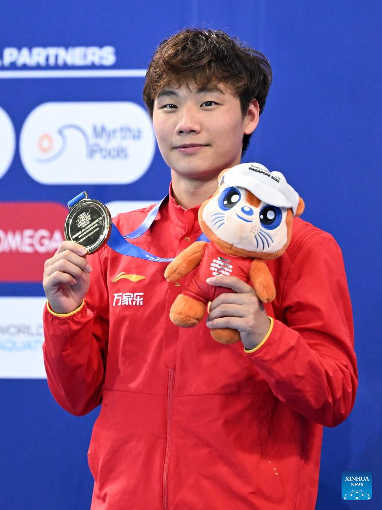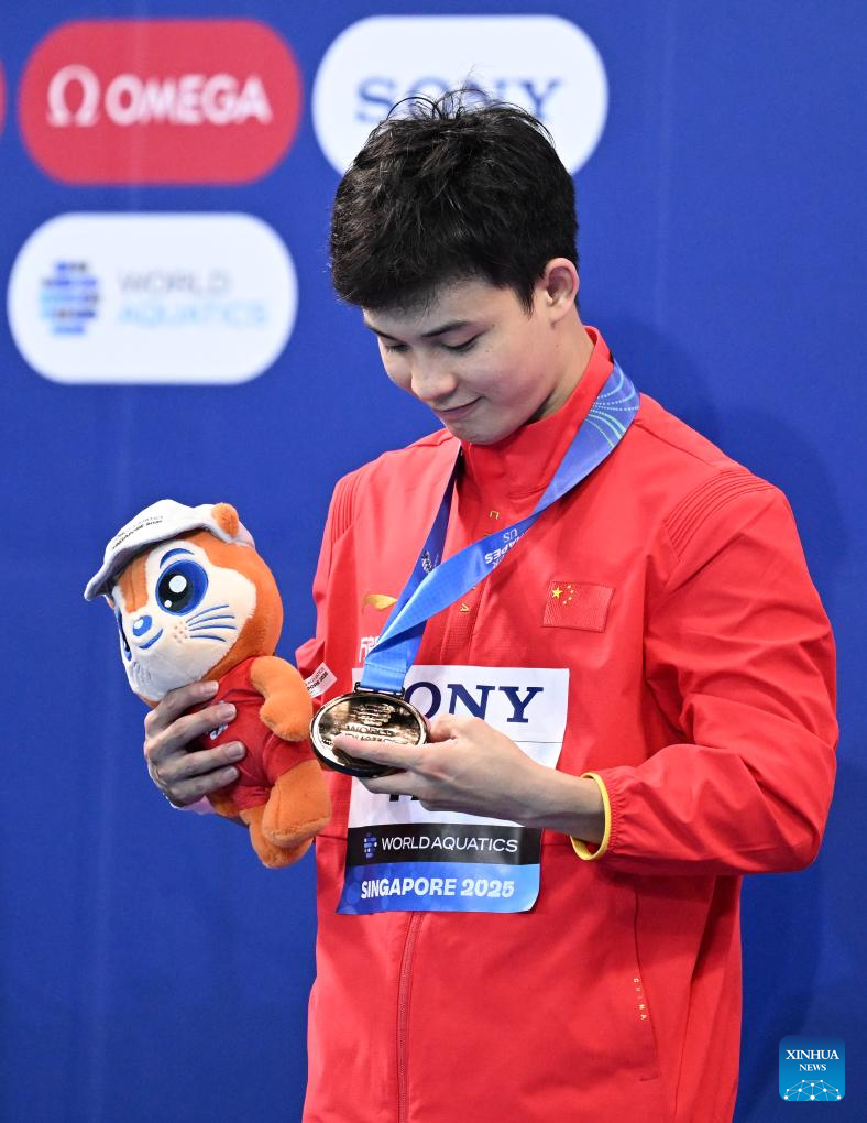 Gold medalist Zheng Jiuyuan of China poses for photo after the awarding ceremony for the men's 1m springboard of diving at the World Aquatics Championships in Singapore, July 27, 2025. (Xinhua/Xue Yuge)