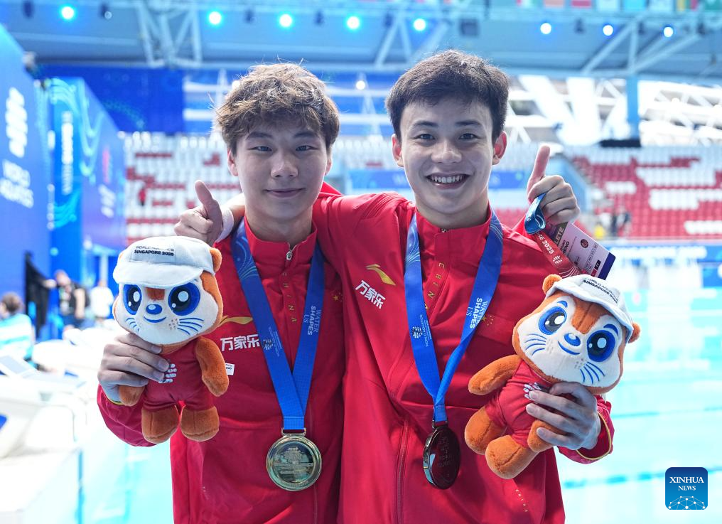 Gold medalist Zheng Jiuyuan (L) of China and bronze medalist Yan Siyu of China pose for photo after the awarding ceremony for the men's 1m springboard of diving at the World Aquatics Championships in Singapore, July 27, 2025. (Xinhua/Xue Yuge)