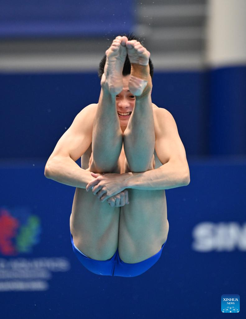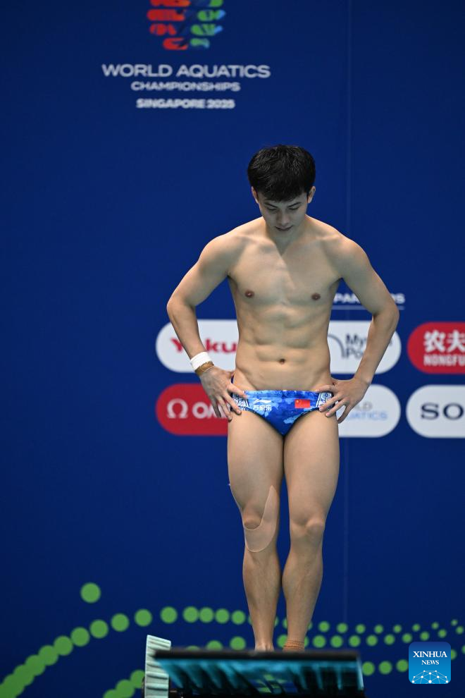 Zheng Jiuyuan of China competes during the men's 1m springboard final of diving at the World Aquatics Championships in Singapore, July 27, 2025. (Xinhua/Xue Yuge)