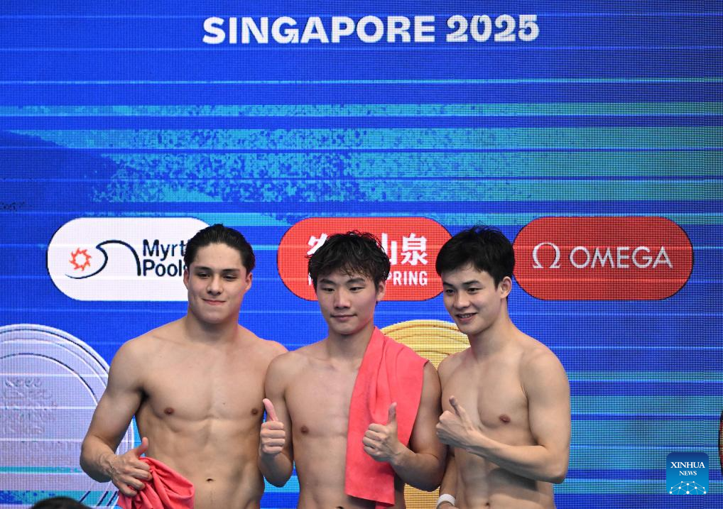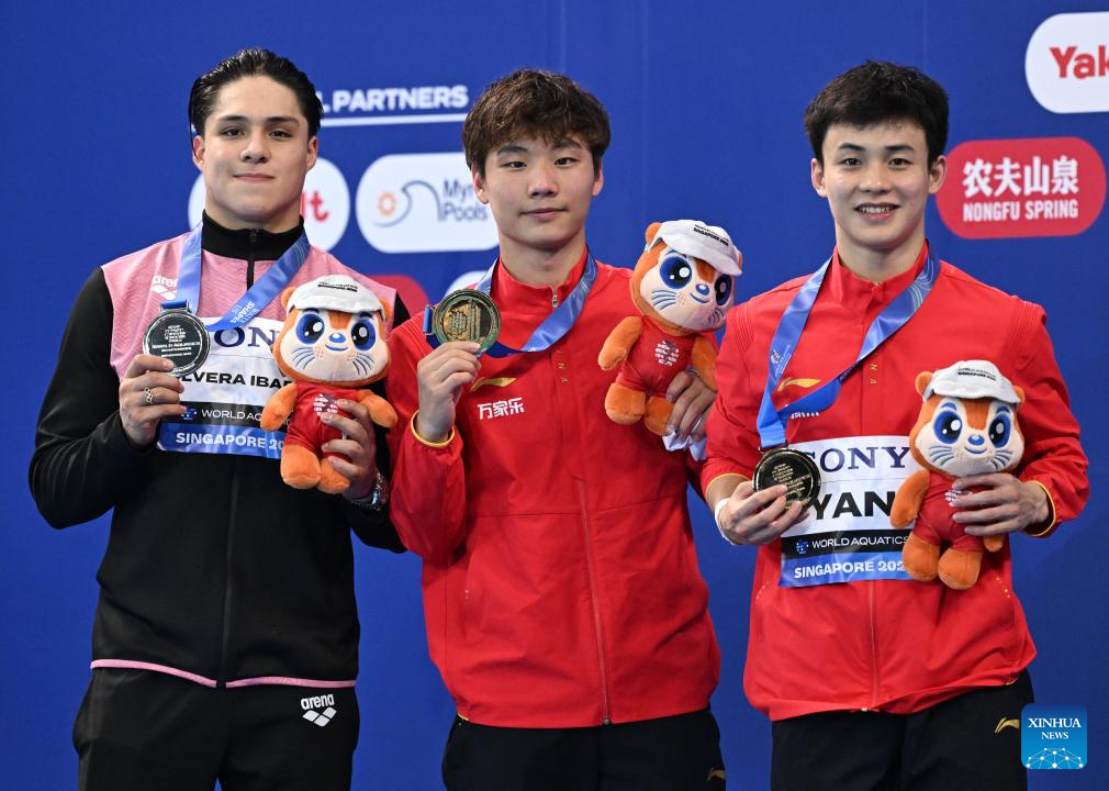 Gold medalist Zheng Jiuyuan (C) of China, silver medalist Osmar Olvera Ibarra (L) of Mexico and bronze medalist Yan Siyu of China pose for photo during the awarding ceremony for the men's 1m springboard of diving at the World Aquatics Championships in Singapore, July 27, 2025. (Xinhua/Xue Yuge)