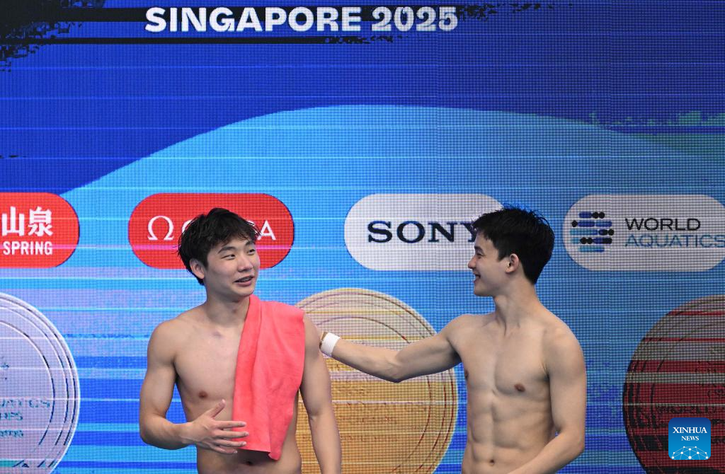 Yan Siyu (front) of China reacts during the men's 1m springboard final of diving at the World Aquatics Championships in Singapore, July 27, 2025. (Xinhua/Xue Yuge)