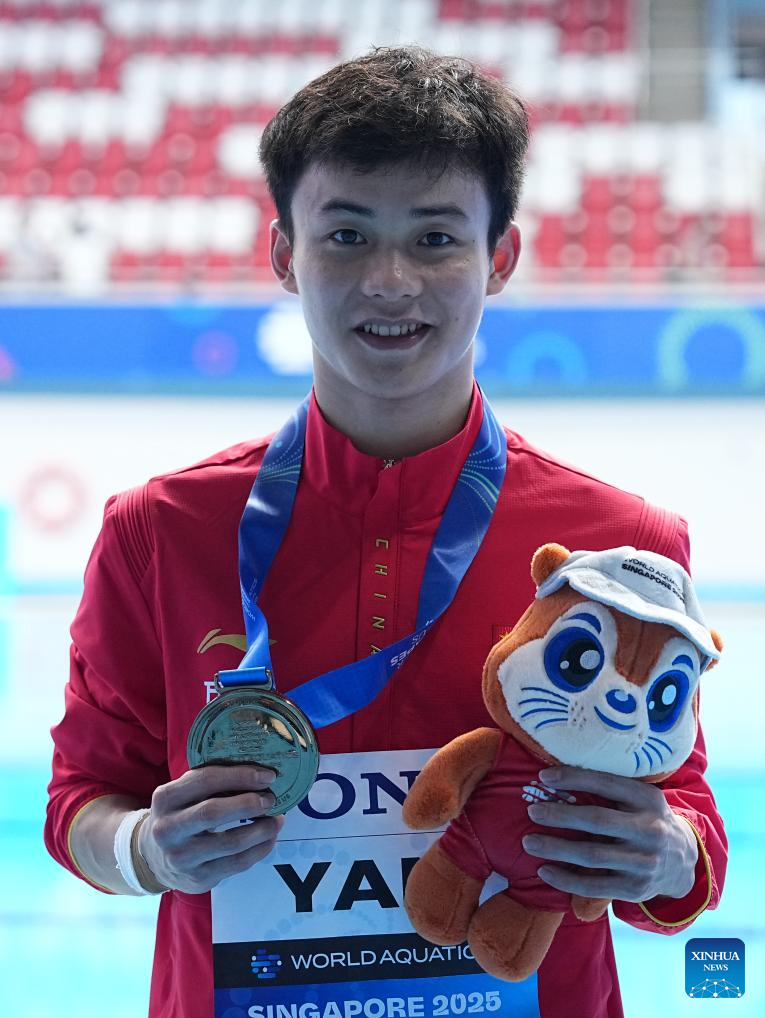 Bronze medalist Yan Siyu of China poses for photos after the awarding ceremony for the men's 1m springboard of diving at the World Aquatics Championships in Singapore, July 27, 2025. (Xinhua/Xue Yuge)