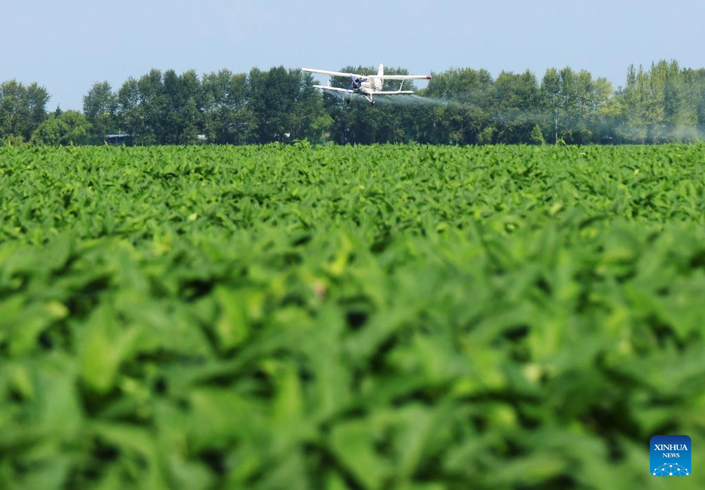 An agricultural aircraft flies above a soybean field at the Beidahuang Group Heilongjiang Hongxing Farm in Bei'an City, northeast China's Heilongjiang Province, July 25, 2025. Aerial crop protection operations have commenced across various agricultural production units of the Beidahuang Group, covering more than 30 million mu (about 2 million hectares) of dry farmlands. (Photo by Hou Yue/Xinhua)