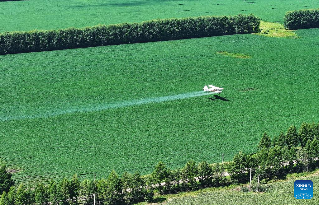 An aerial drone photo taken on July 25, 2025 shows an agricultural aircraft flying above a soybean field at the Beidahuang Group Heilongjiang Hongxing Farm in Bei'an, northeast China's Heilongjiang Province. Aerial crop protection operations have commenced across various agricultural production units of the Beidahuang Group, covering more than 30 million mu (about 2 million hectares) of dry farmlands. (Photo by Hou Yue/Xinhua)