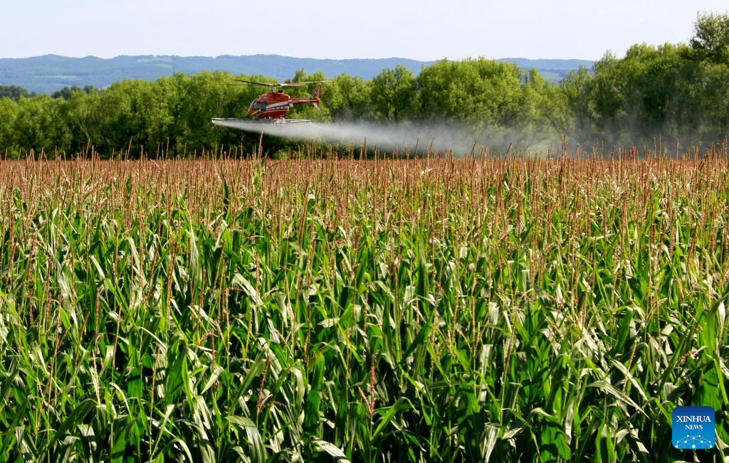 An aerial drone photo taken on July 27, 2025 shows an agricultural helicopter flying above a corn field at the Beidahuang Group Heilongjiang Weishan Farm in Wudalianchi City, northeast China's Heilongjiang Province. Aerial crop protection operations have commenced across various agricultural production units of the Beidahuang Group, covering more than 30 million mu (about 2 million hectares) of dry farmlands. (Photo by Lu Wenxiang/Xinhua)
