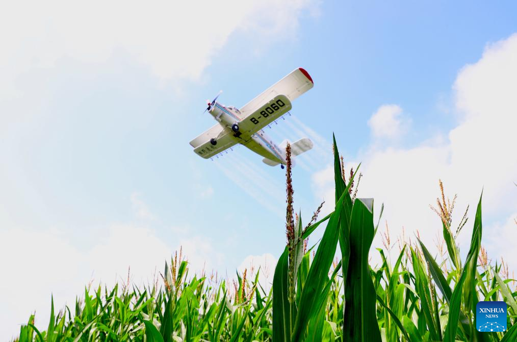 An aerial drone photo taken on July 27, 2025 shows an agricultural aircraft flying above a corn field at the Youyi Farm under Beidahuang Group in Shuangyashan City, northeast China's Heilongjiang Province. Aerial crop protection operations have commenced across various agricultural production units of the Beidahuang Group, covering more than 30 million mu (about 2 million hectares) of dry farmlands. (Photo by Xu Hongyu/Xinhua)