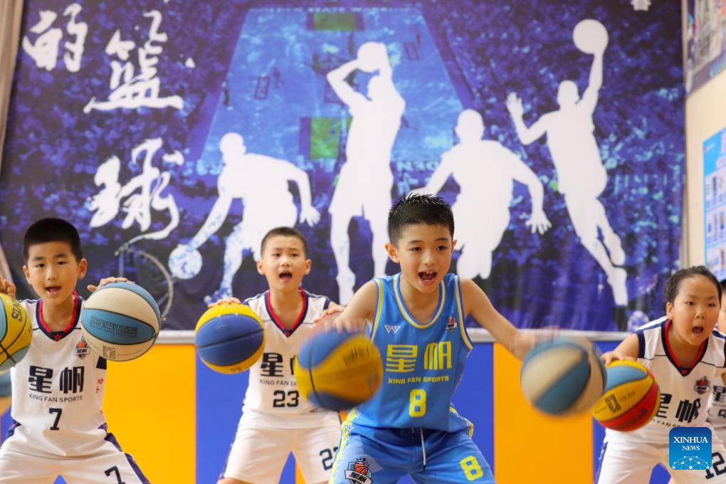 Children learn basketball skills in Gaomi City, east China's Shandong, July 25, 2025. Children participate in various activities during summer vacation across the country. (Photo by Li Haitao/Xinhua)