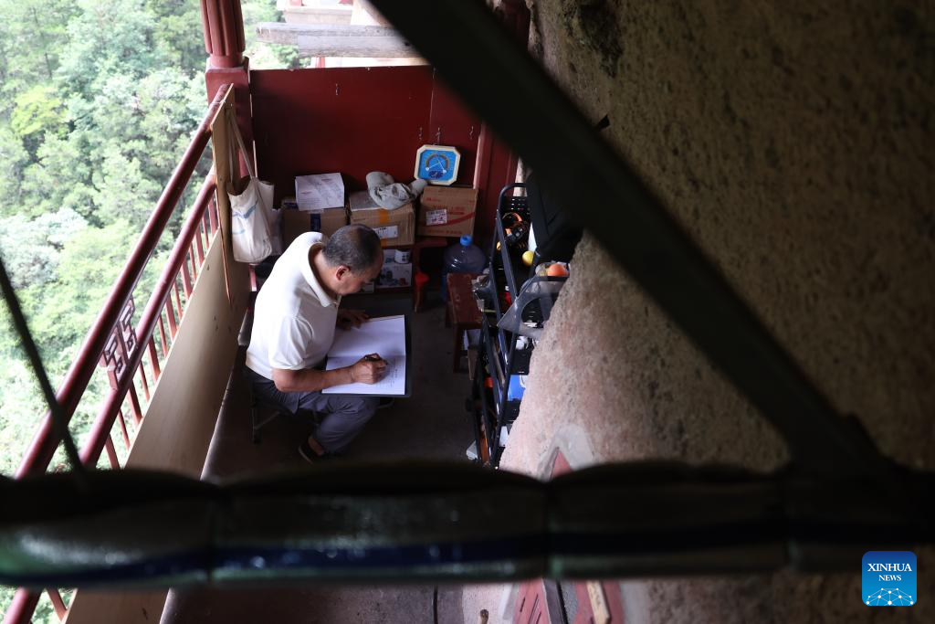 Mu Changyou, a cultural relics restorer of Maiji Mountain Grottoes art institute, fills out a logbook for restoration work at a cave of the Grottoes in Tianshui City, northwest China's Gansu Province on July 16, 2025. (Xinhua/Chen Bin)