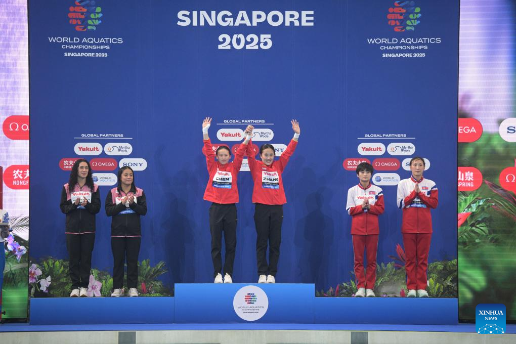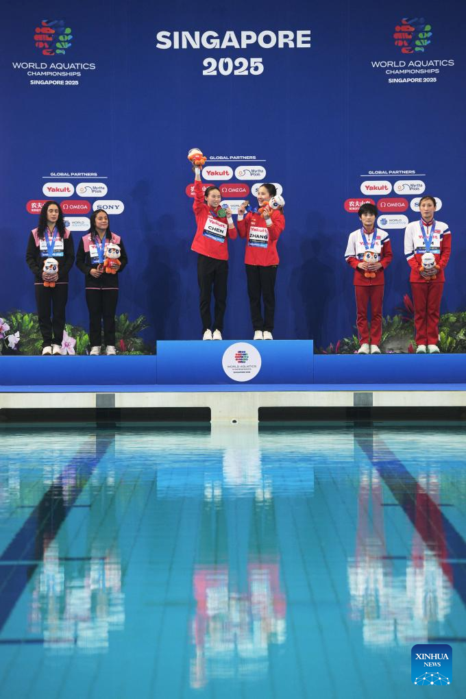 Gold medalists Chen Yuxi (3rd L)/Zhang Minjie (3rd R) of China, silver medalists Alejandra Estudillo Torres (2nd L)/Gabriel Agundez Garcia (1st L) of Mexico and bronze medalists Kim Mi Hwa (1st R)/Jo Jin Mi of the Democratic People's Republic of Korea (DPRK) pose during the awarding ceremony for the women's 10m synchronised final of diving at the World Aquatics Championships in Singapore, July 28, 2025. (Photo by Then Chih Wey/Xinhua)