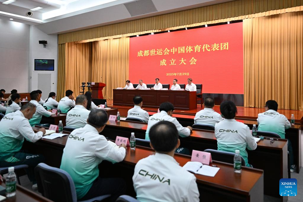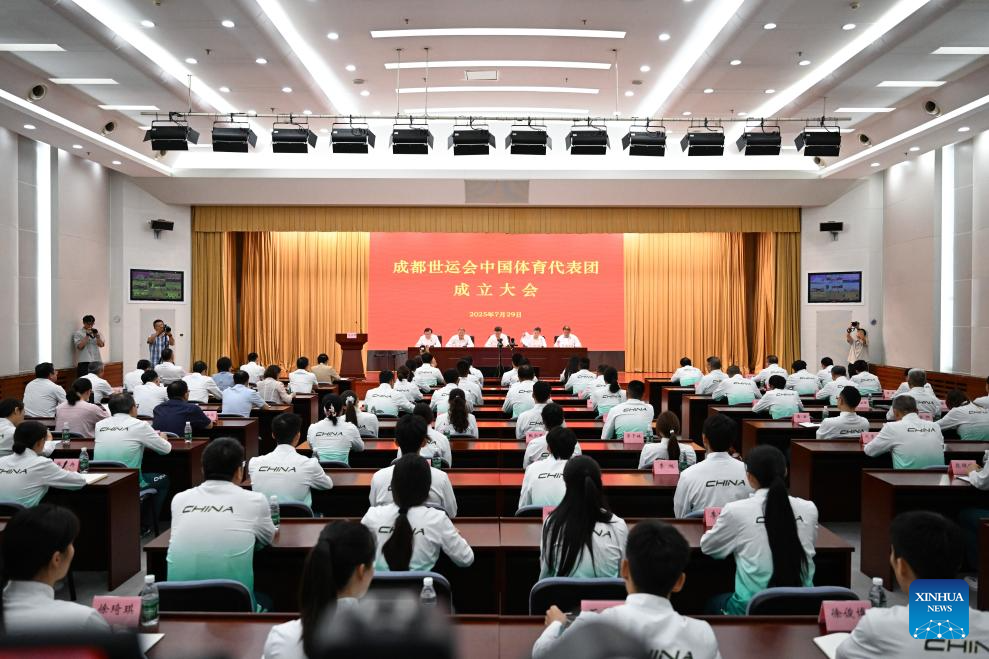 This photo taken on July 29, 2025 shows the view of the Chinese delegation's launch ceremony for the upcoming 2025 Chengdu World Games in Beijing, capital of China. China unveiled a 489-member delegation, including 321 athletes. The team will compete in 152 events across 28 sports, marking China's largest participation in the history of the Games. (Xinhua/Song Yanhua)