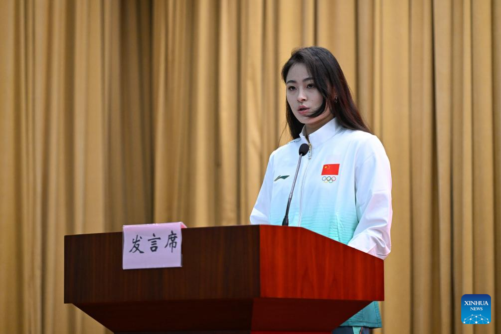 Gong Li, a karateka, delivers a speech at the Chinese delegation's launch ceremony for the upcoming 2025 Chengdu World Games in Beijing, capital of China, July 29, 2025. China unveiled a 489-member delegation, including 321 athletes. The team will compete in 152 events across 28 sports, marking China's largest participation in the history of the Games. (Xinhua/Song Yanhua)