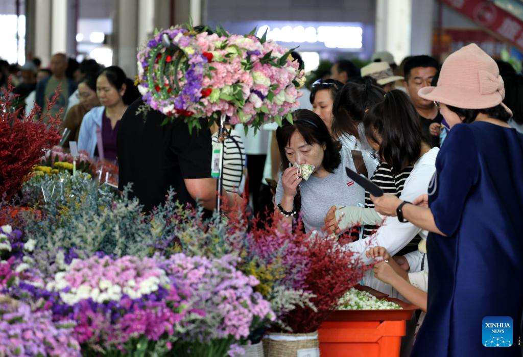 Tourists purchase flowers at the Dounan Flower Market in Kunming, southwest China's Yunnan Province, July 28, 2025. As one of Asia's largest fresh-cut flower trading markets, the Dounan Flower Market attracts tourists from China and abroad.