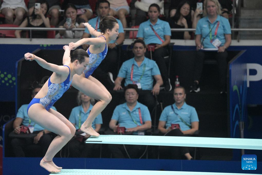 Chen Jia (R)/Chen Yiwen of China compete during the women's 3m synchronised springboard final of diving at the World Aquatics Championships in Singapore, July 29, 2025. (Xinhua/Wu Zhizun)