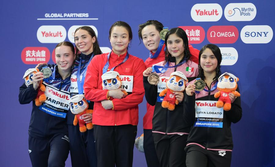 Gold medalists Chen Jia (3rd L)/Chen Yiwen (3rd R) of China, silver medalists Yasmin Harper (1st L)/Scarlett Mew Jensen (2nd L) of Great Britain and bronze medalists Lia Cueva Lobato/Mia Cueva Lobato of Mexico pose with their medals, July 29, 2025. (Xinhua/Wu Zhizun)