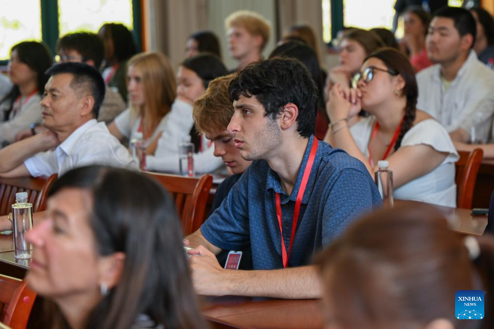 Members of a U.S. delegation watch a documentary titled "Touching the Tigers" in Hong'an County, central China's Hubei Province, July 28, 2025. A delegation of descendants of U.S. Flying Tigers veterans, and students and teachers from several Flying Tigers friendship schools, led by Jeffrey Greene, chairman of the Sino-American Aviation Heritage Foundation, visited Hubei from July 26 to 30. (Xinhua/Du Zixuan)